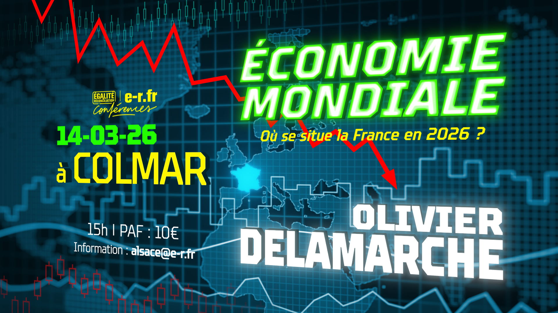 30 Août2025 Réservations Conférence Written by Alsace. Posted in Non classés Conférence Rendez-vous est donné à tous à 15h00, samedi 14 mars 2026 à Colmar pour une conférence. Le lieu exact de l’évènement sera communiqué par mail et SMS le jour même en début de mâtinée aux inscrits ayant effectué leur règlement. Pour toute question ou problème, écrivez-nous à : alsace@e-r.fr À propos de la conférence : – Conférencier : Olivier DELAMARCHE – Thème : Économie mondiale : Où se situe la France en 2026 ? – Participation aux frais: 10€ Un stand Kontre Kulture bien fourni avec les dernières nouveautés sera disponible sur place. Les règlements par carte bancaire via Paypal sur place seront possibles. Attention : Pour effectuer le règlement de votre réservation, il n’est pas nécessaire de posséder de compte Paypal. Une fois que vous aurez été redirigé sur la page Paypal, choisissez simplement « payer sans ouvrir de compte » tout en bas du formulaire de connexion. Pour toute question ou problème, écrivez-nous à : alsace@e-r.fr Réserver Nous aider, faire un don : Lire la suite